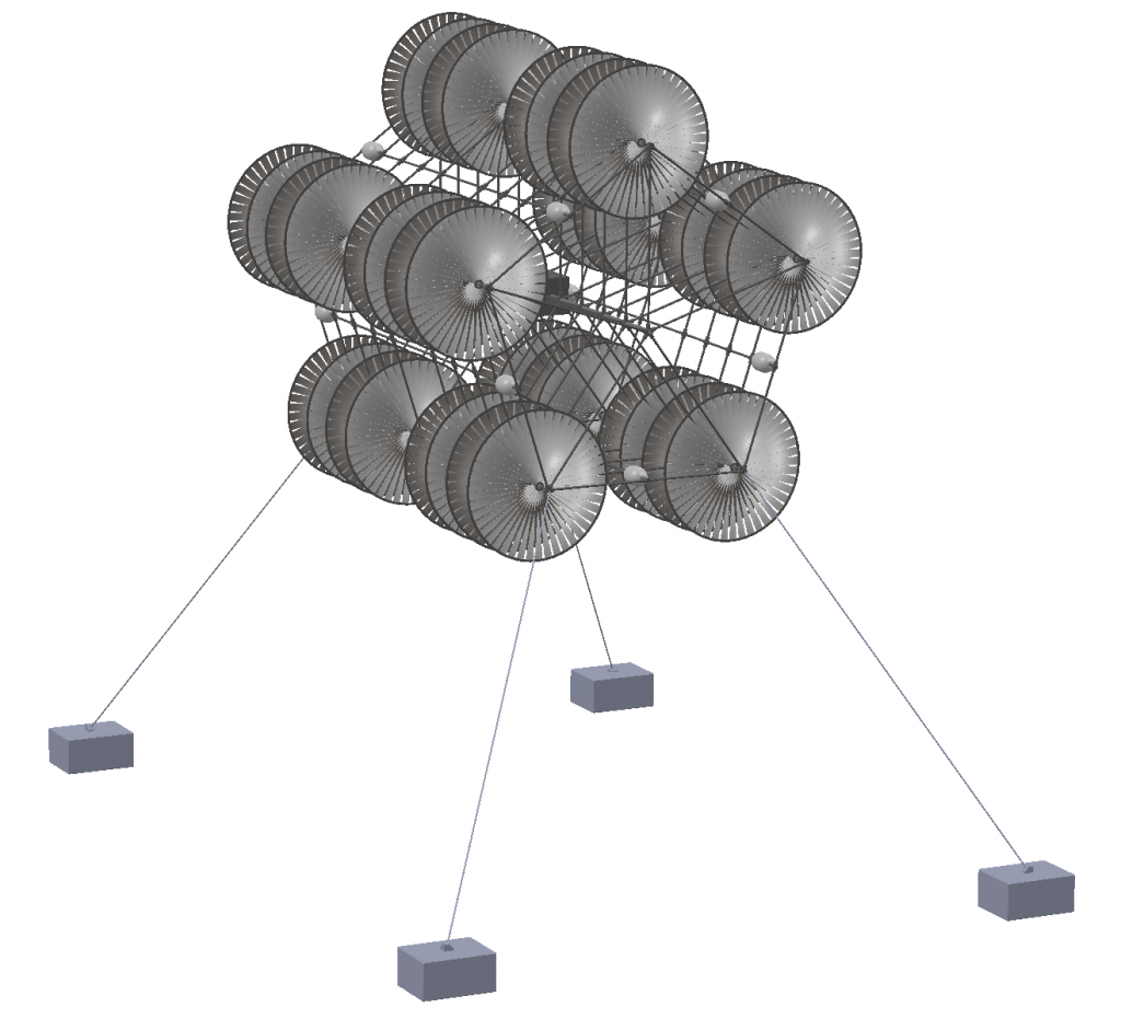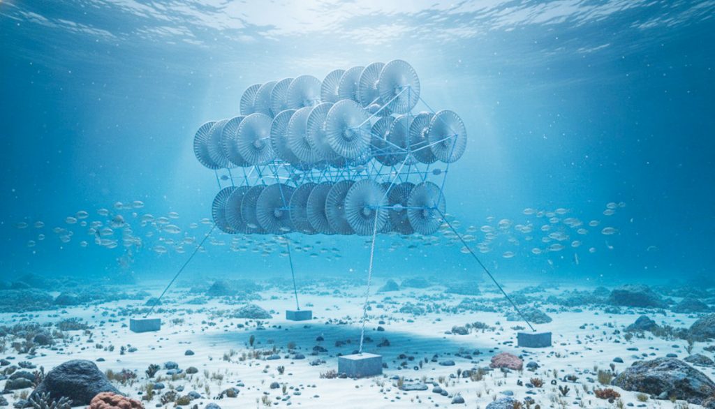 Anchor cables are connected at the four lower corners of the structure and secured to concrete anchor blocks on the seafloor. This anchoring system maintains the module’s position within the ocean current while preventing rotational movement caused by hydrodynamic forces.